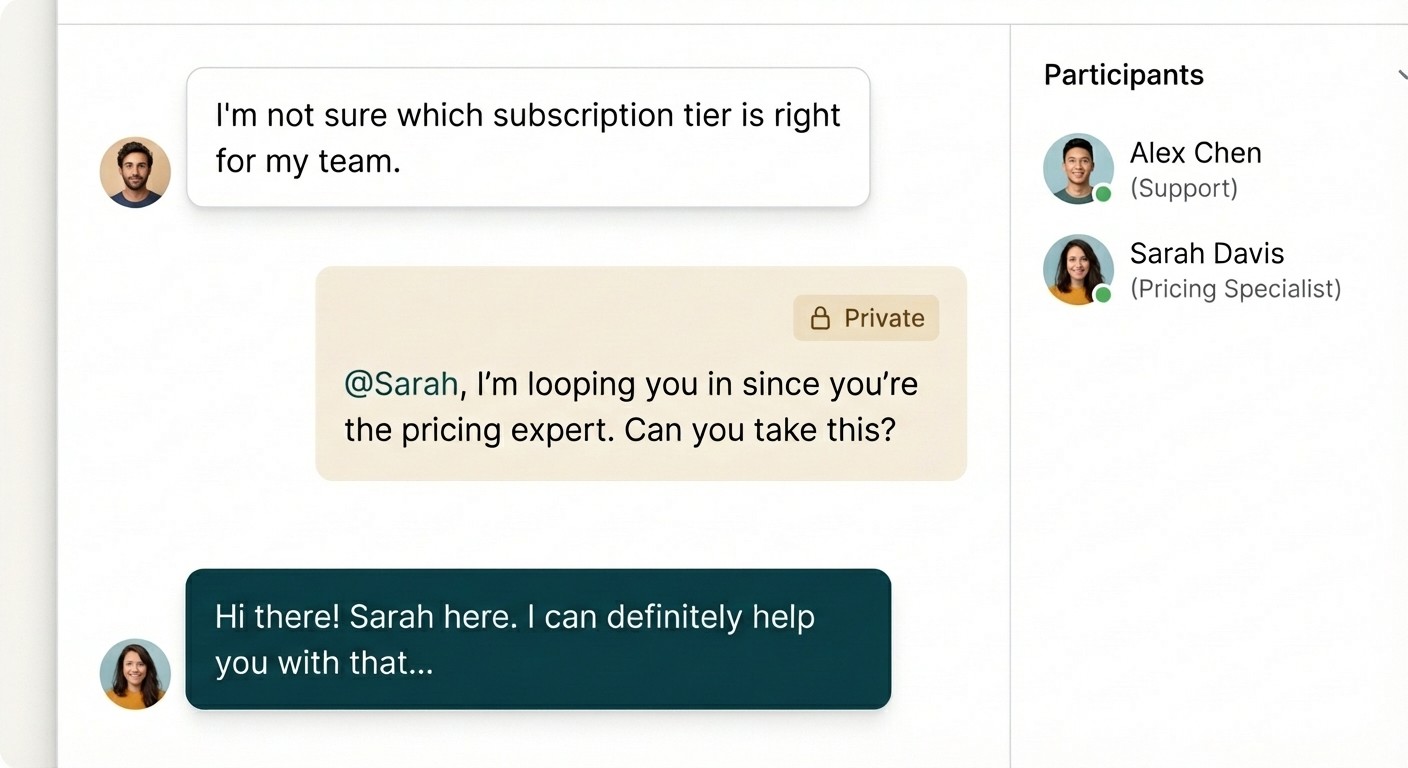 Loop in experts or share a conversation. Seamless handoffs ensure the customer never feels "passed around."