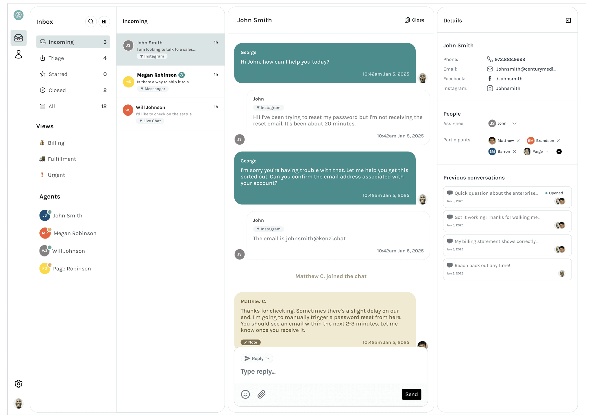 Quit jumping between Instagram, Facebook, email, live chat, etc, to chase down messages. Kenzi stitches every channel into one continuous conversation, so you can see the full story without leaving the page.